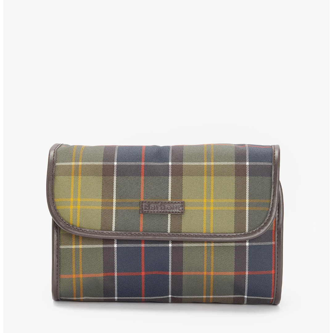 The Barbour tartan hanging washbag features a faux leather trim for a touch of sophistication. A concealed stud fastening under the front flap folds out to reveal multiple inner pockets for handy storage while you're on your travels. Boasting a hanging hook for functionality, the wash bag is finished with a discreet Barbour embossed badge to the front flap.