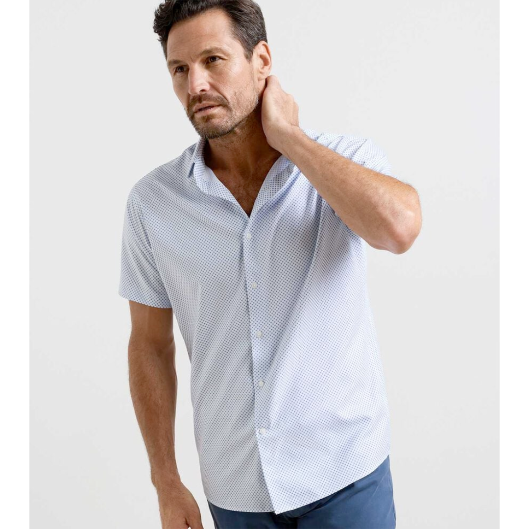 This short-sleeve sport shirt is made from a soft performance fabric with two-way stretch, wicking and UPF 50+ sun protection. Finished with a spread collar and a French placket.